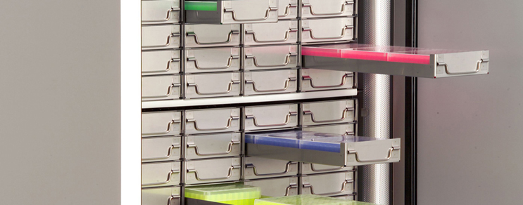 -  Schrankeinschübe aus Edelstahl für Kryoboxen